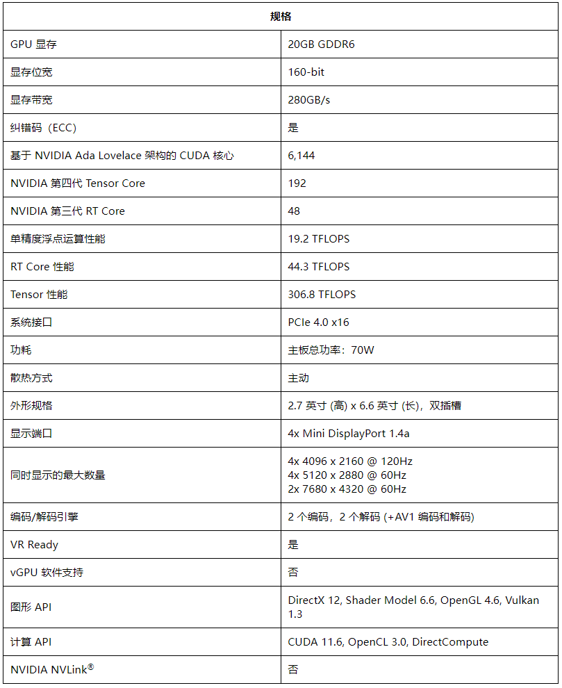 NVIDIA RTX 4000 SFF Ada Generation采用紧凑的设计,集专业人士所需的特性、功能和性能于一身。RTX 4000 SFF 基于 NVIDIA Ada Lovelace GPU 架构构建,结合了第三代RT Core、第四代Tensor Core 和下一代 CUDA® 核心以及 20GB 显存。