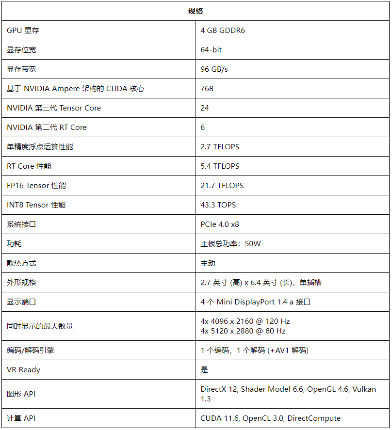 NVIDIA RTX™A400基于NVIDIA Ampere GPU架构,将AI和光线追踪加速的强大功能带入入门级工作站,使更多专业人士可以使用它。