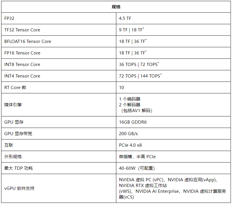 NVIDIA A2 Tensor Core GPU 具有低功耗、小尺寸和高性能的特点,可为在边缘部署 NVIDIA AI 的智能视频分析 (IVA) 提供入门级推理功能。该 GPU 采用半高 PCIe 4.0 卡的设计,并提供 40-60 瓦的低热设计功耗 (TDP) 配置功能。
