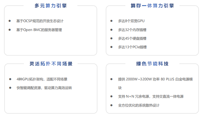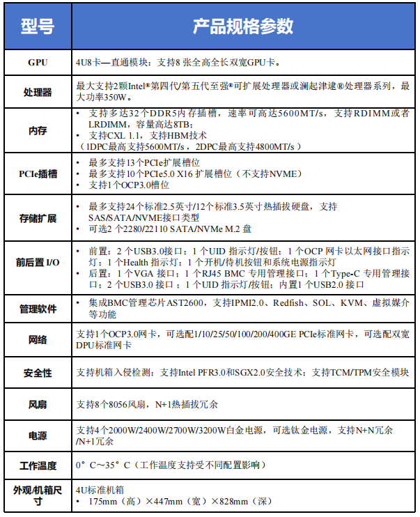 | GPU | 4U8卡—直通模块:支持8 张全高全长双宽GPU卡 |