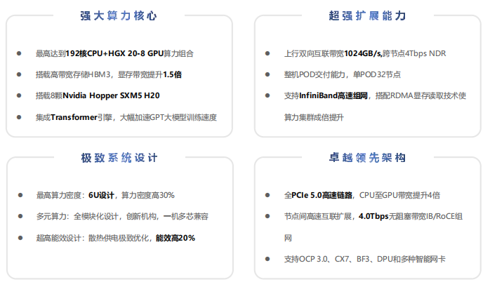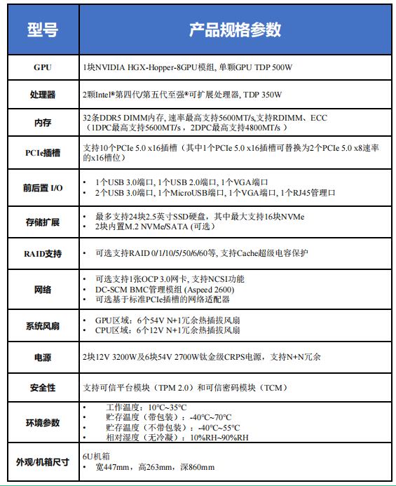 | GPU | 1块NVIDIA HGX-Hopper-8GPU模组, 单颗GPU TDP 400W |