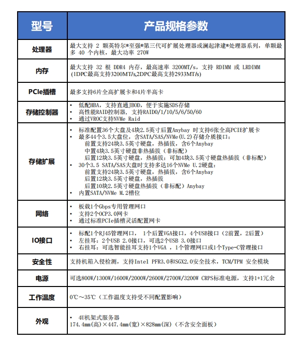 X3-3622S是旭祥推出的一款冷存储服务器。基于英特尔®至强®第三代可扩展处理器,配合8通道3200MT/s DDR4内存技术打造,4U机框前后水平热插拔槽位,标准支持36个3.5盘;支持Broadcom和Microchip两大系列主流HBA和Raid卡;面向金融,安防,交通,能源,教育,医疗,广电等行业,为用户提供高性能、大容量、高扩展性、高可靠性、高性价比的存储服务。