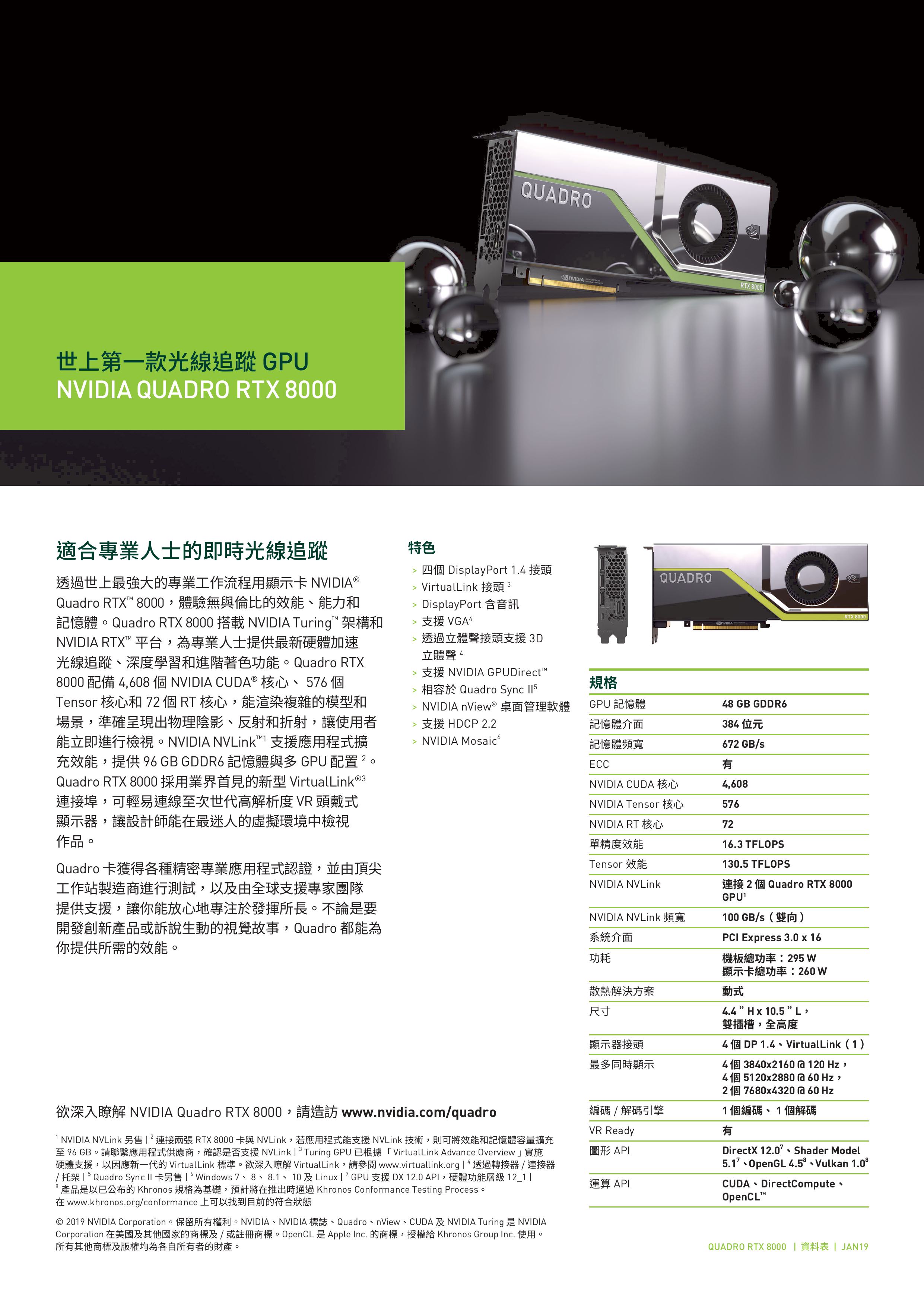 NVIDIA Quadro RTX 8000 使用 NVIDIA Turing™ 架构及 NVIDIA RTX™ 平台,为专业工作流程带来计算机绘图领域十余年来最重大的进步。设计师和艺术家现在可以利用硬件加速光线追踪,深度学习,和高级着色的强大功能,大幅提高生产力,并以前所未有的速度创作出色的内容。