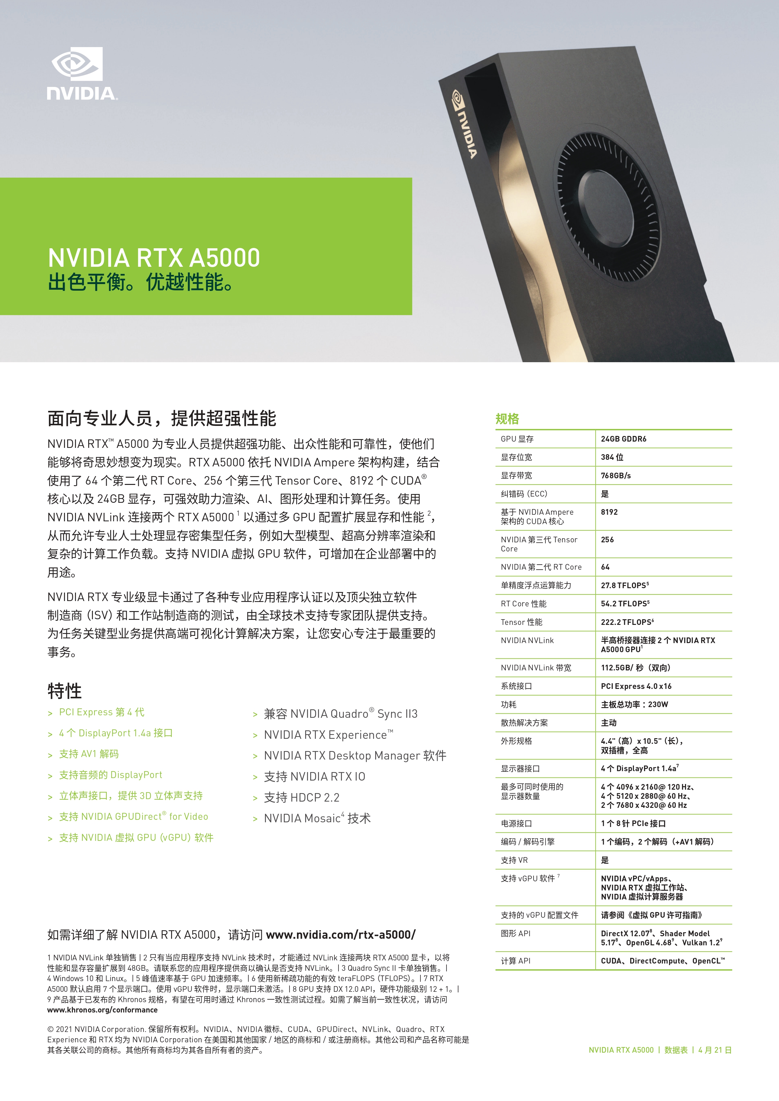 NVIDIA RTX A5000可提供专业人士将其最大胆的创意变为现实所需的功能,性能,功能和可靠性。 借助24 GB的GPU内存,您使用的应用程序将获得更快的性能。