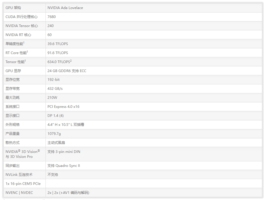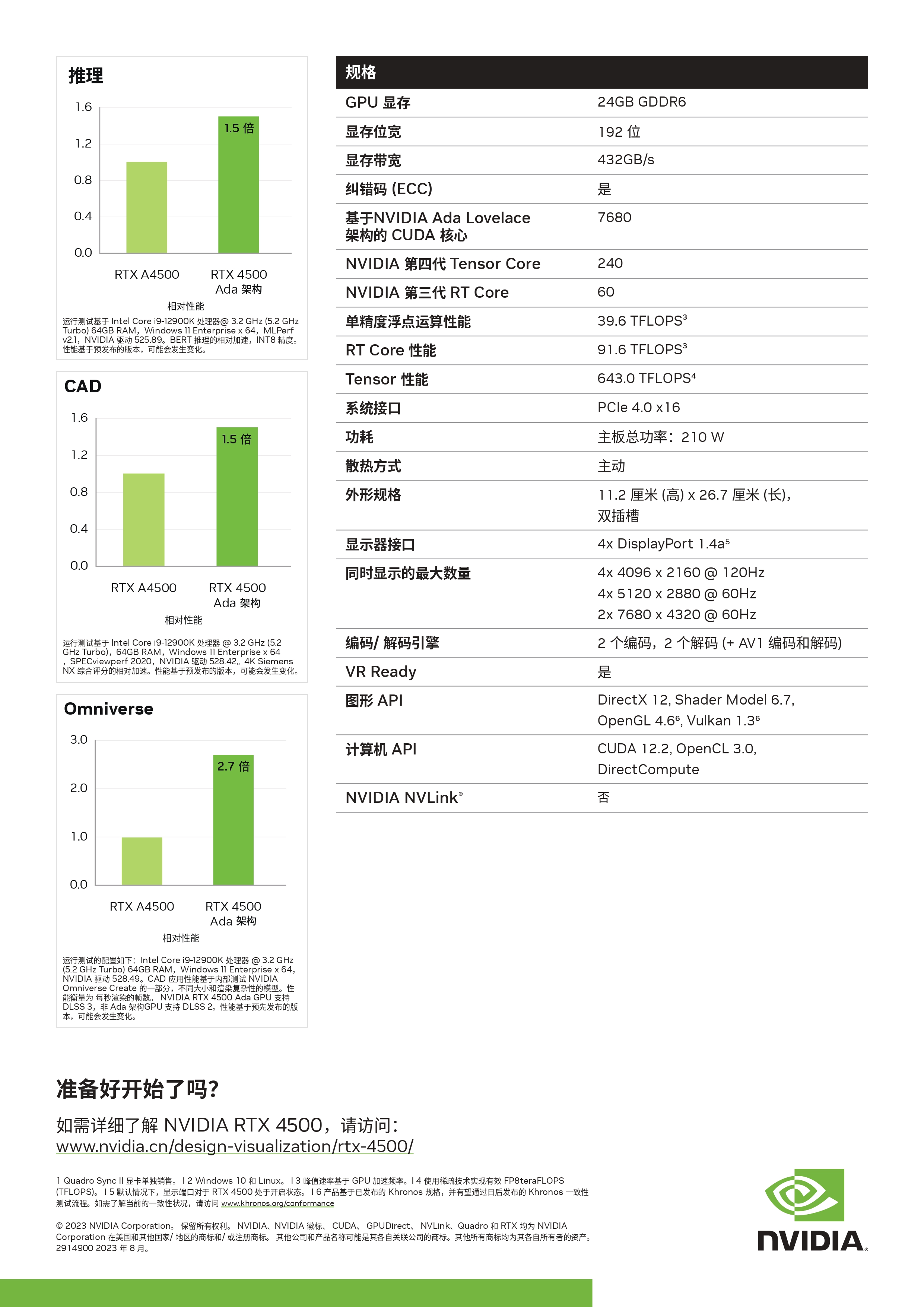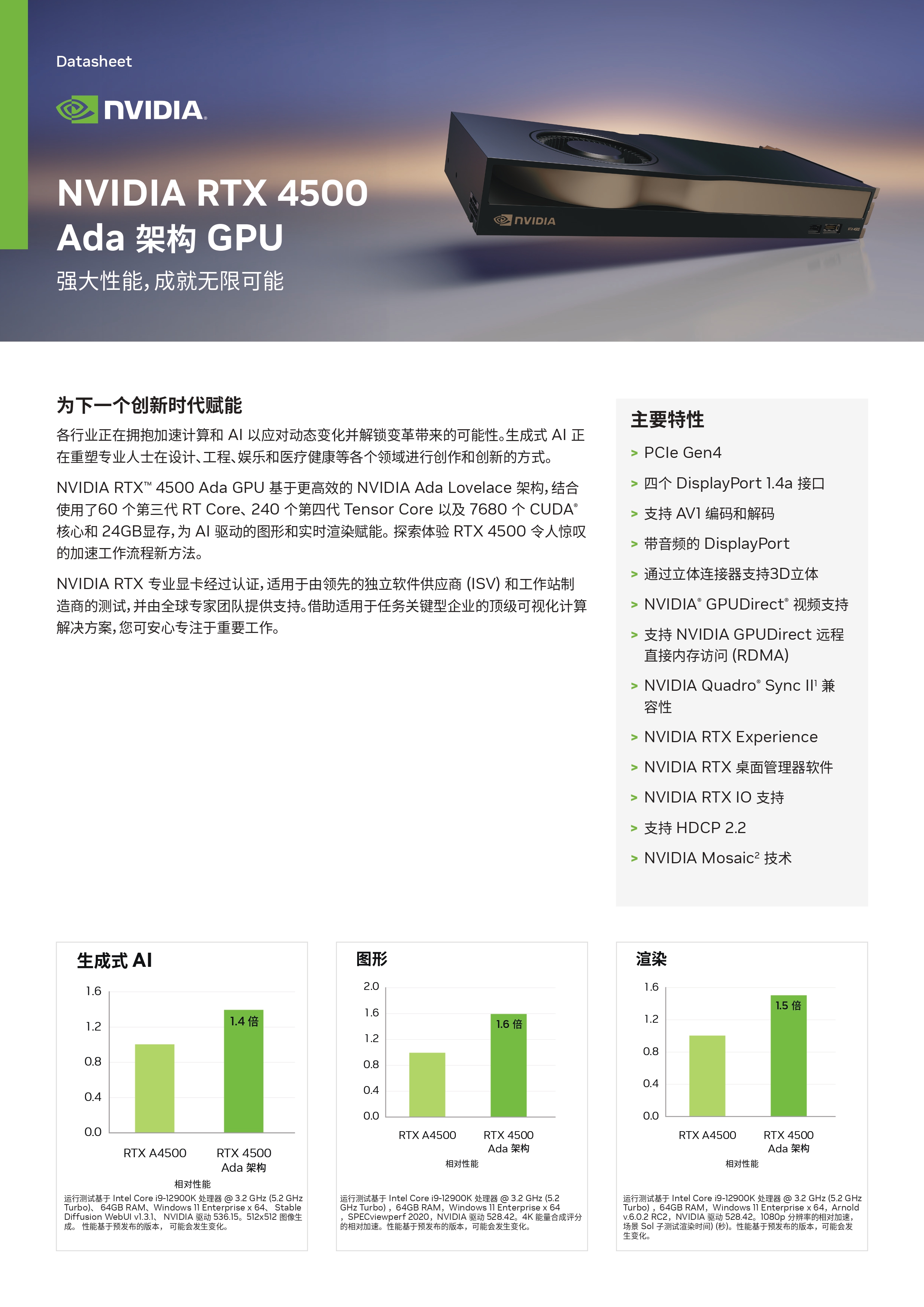 NVIDIA RTX™ 4500 Ada Generation 基于超高效的 NVIDIA Ada Lovelace 架构构建,结合了 60 个第三代 RT 核心、240 个第四代 Tensor 核心和 7,680 个 CUDA® 核心以及 24GB 显存,可提供快速的光线追踪和 AI 驱动的图形处理能力。