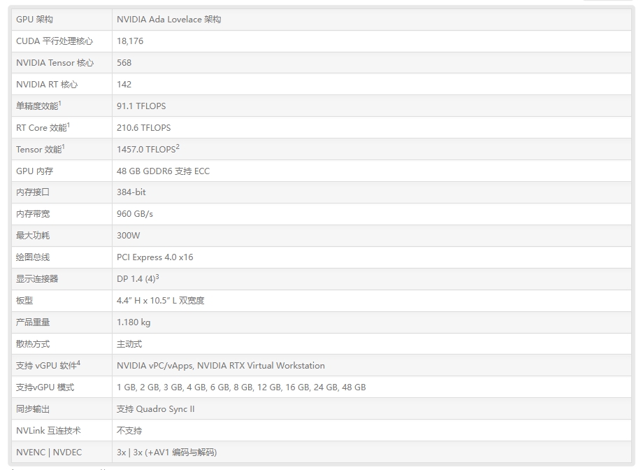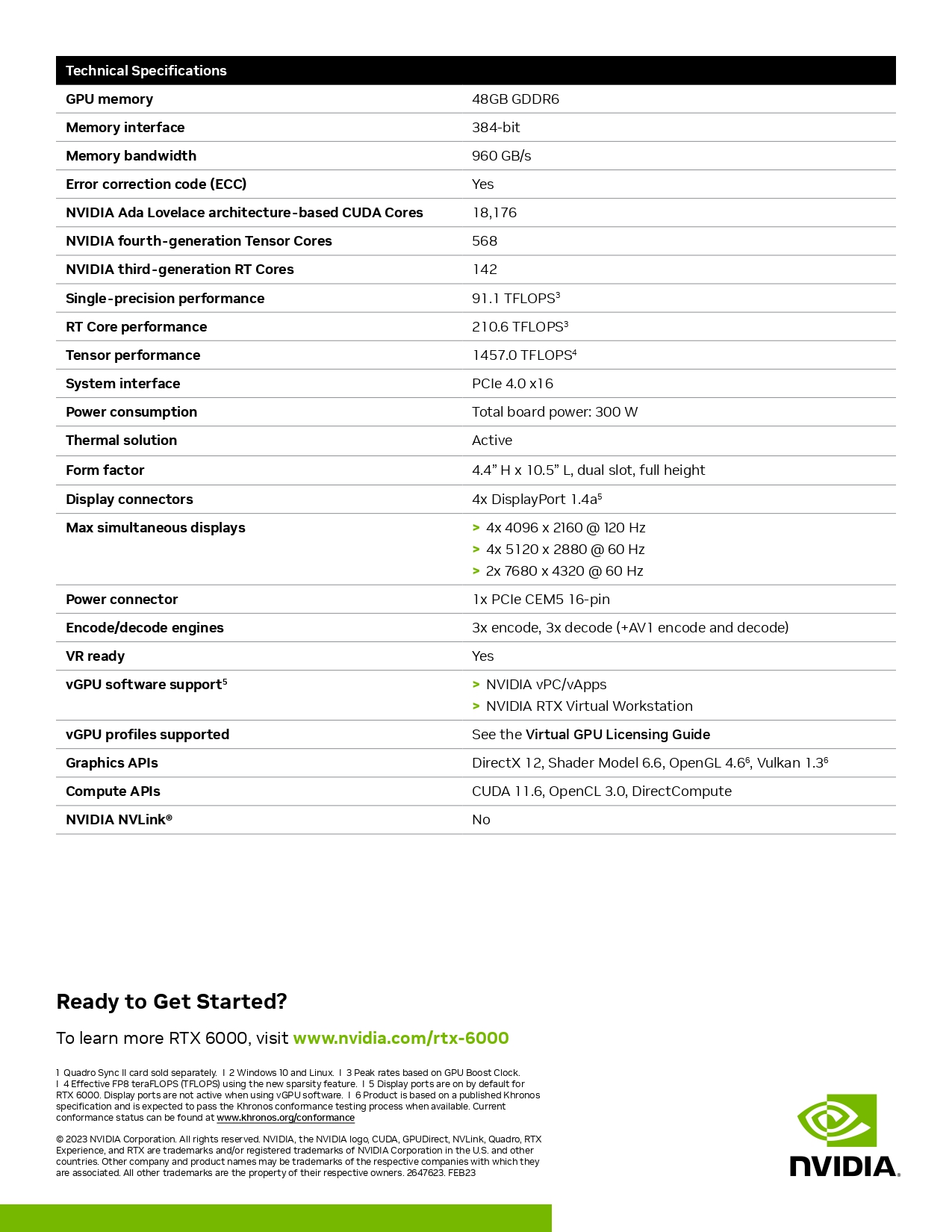 NVIDIA RTX™ 6000 Ada Generation 提供可应对专业工作流程挑战的必备功能与效能。RTX 6000 采用 NVIDIA Ada Lovelace 架构,结合第三代 RT 核心、第四代 Tensor 核心。