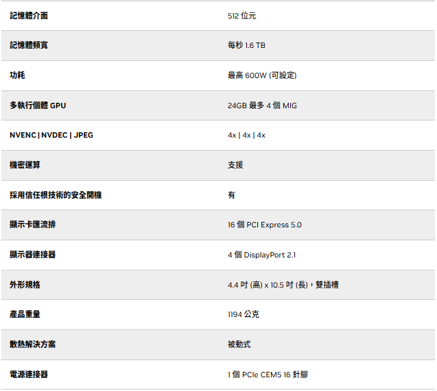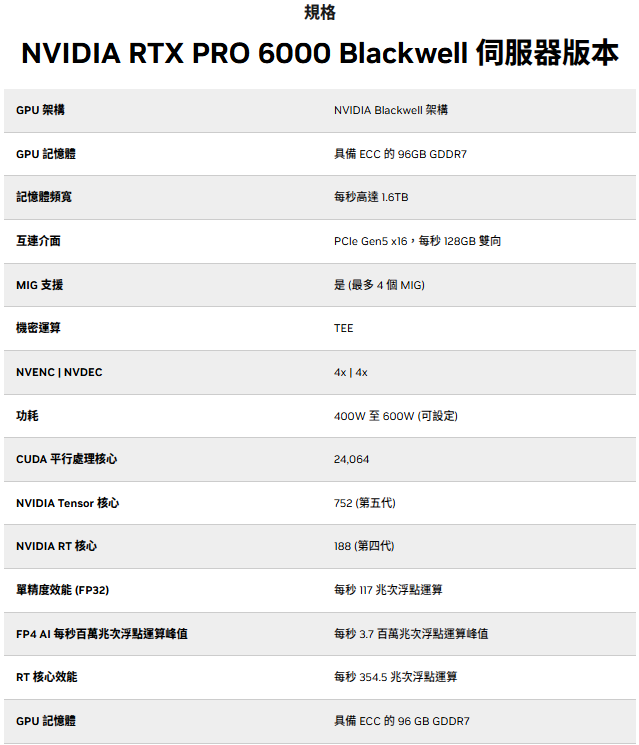 NVIDIA RTX PRO™ 6000 Blackwell 服务器版本採用突破性的 NVIDIA Blackwell 架構,可提供強大的人工智慧與視覺運算功能,加速企業資料中心的工作負載。NVIDIA RTX PRO 6000 Blackwell 搭載 96GB 超高速 GDDR7 記憶體。