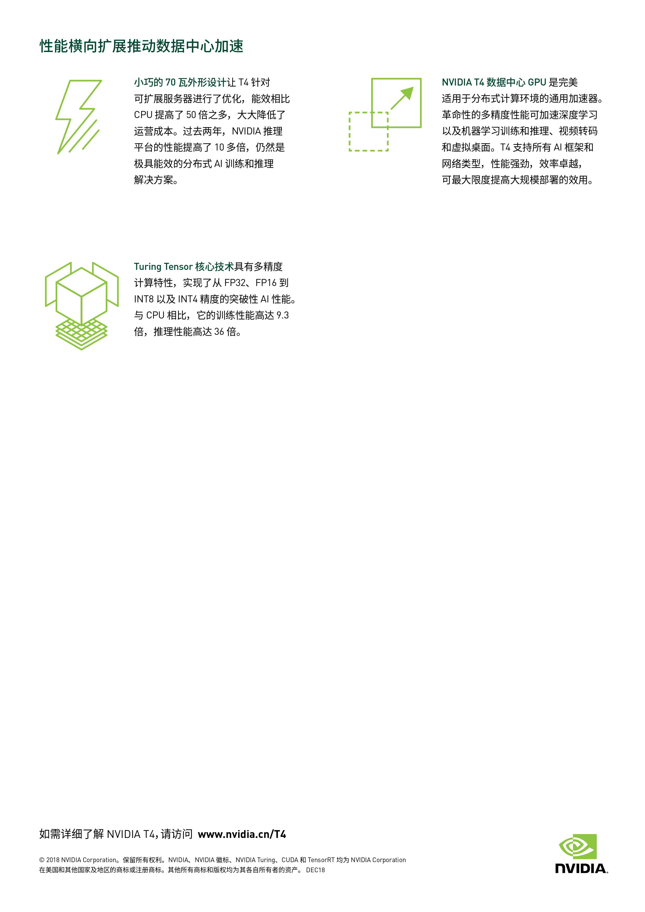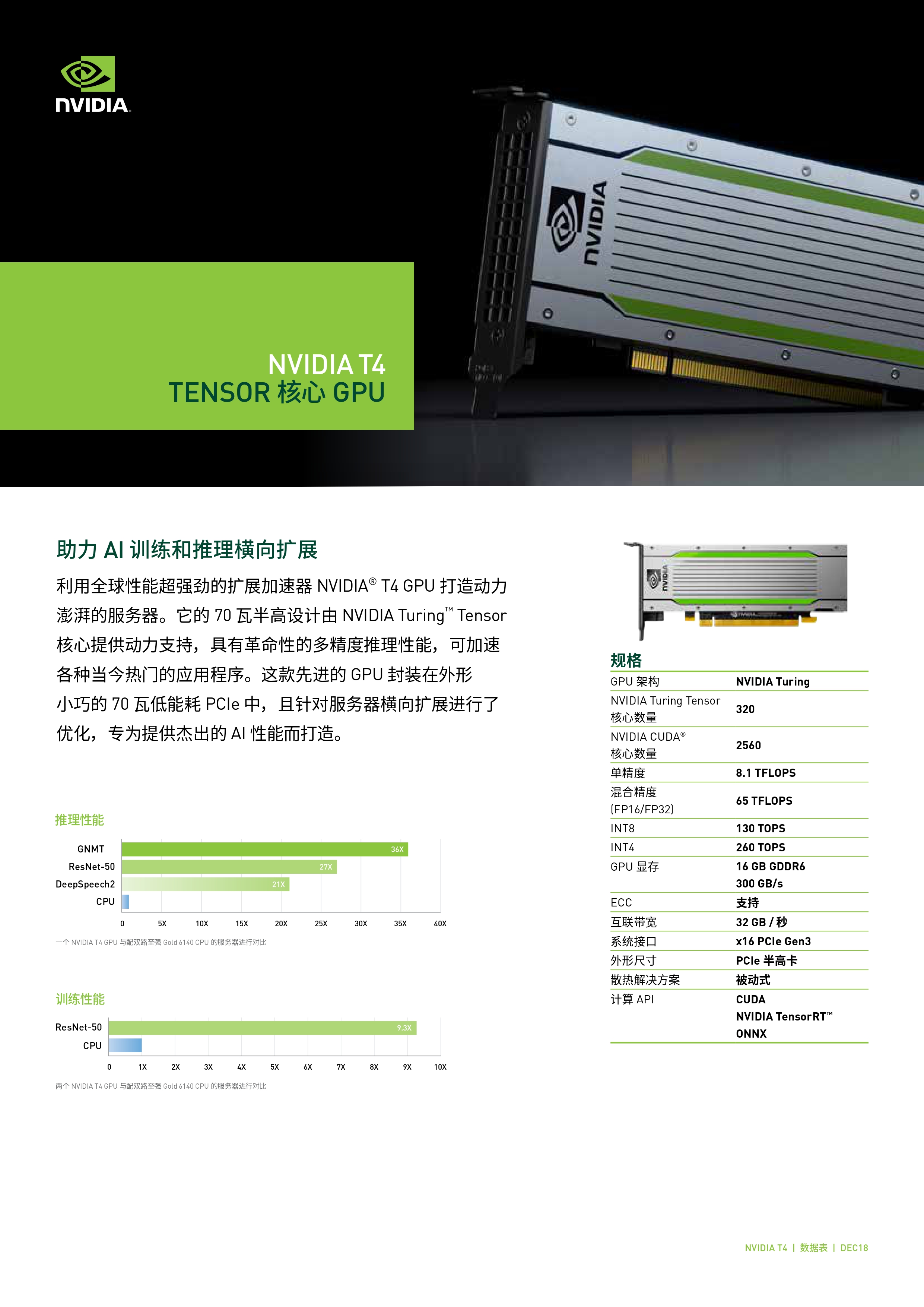 利用全球性能超强劲的扩展加速器 NVIDIA® T4 GPU 打造动力澎湃的服务器。它的 70 瓦半高设计由 NVIDIA Turing™ Tensor核心提供动力支持,具有革命性的多精度推理性能,可加速各种当今热门的应用程序。