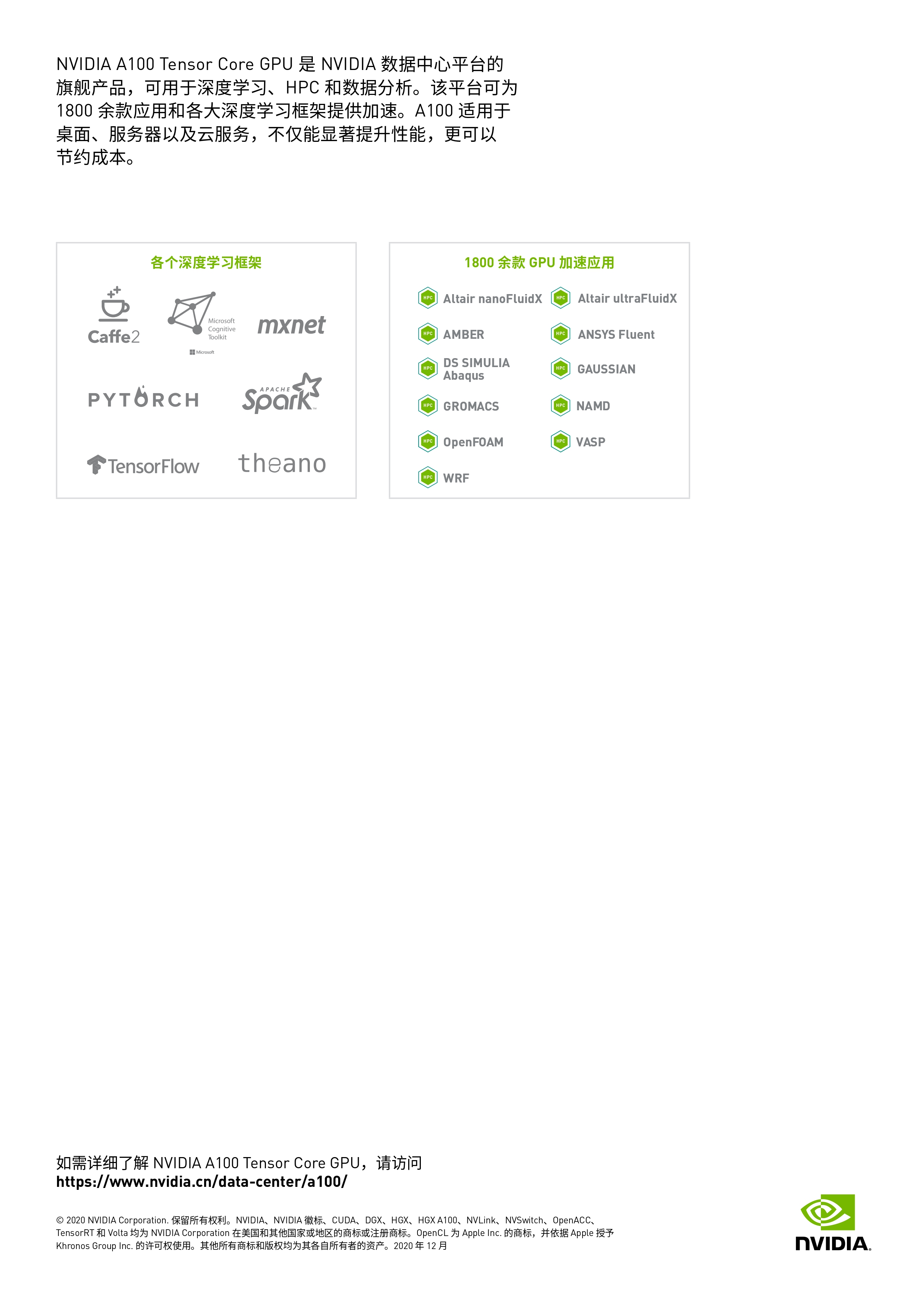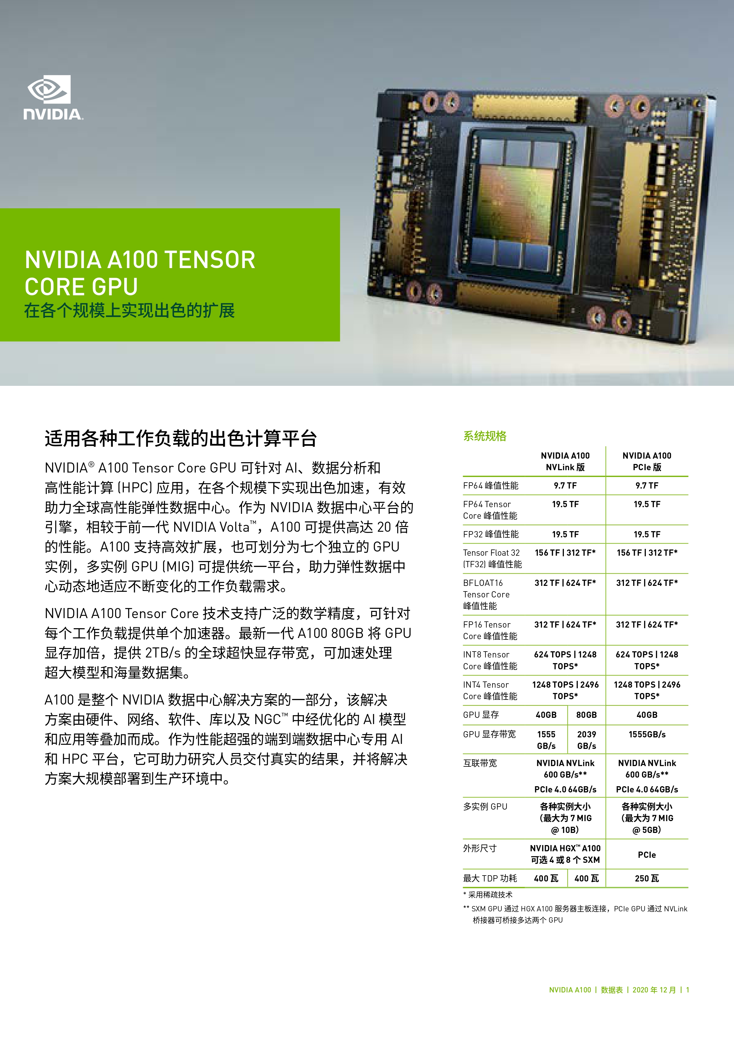 NVIDIA A100张量核心GPU在每个规模上为AI,数据分析和高性能计算(HPC)提供了前所未有的加速度,以应对世界上最艰巨的计算挑战。第三代张量核心加快了各种工作量的精确度,从而超越了时间到洞察力和上市时间。