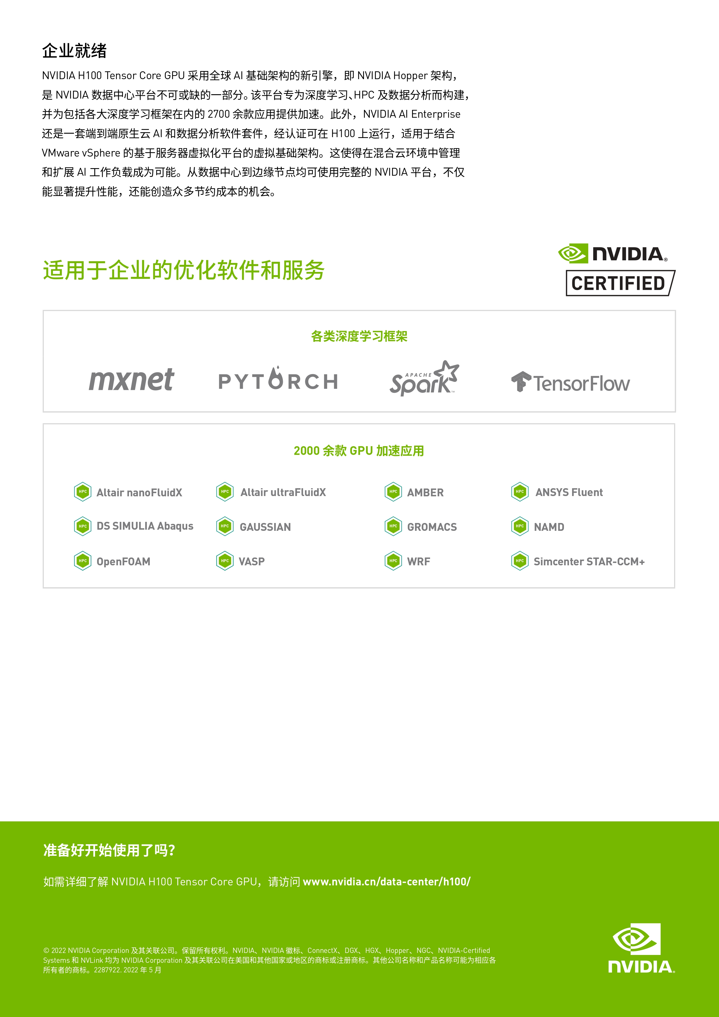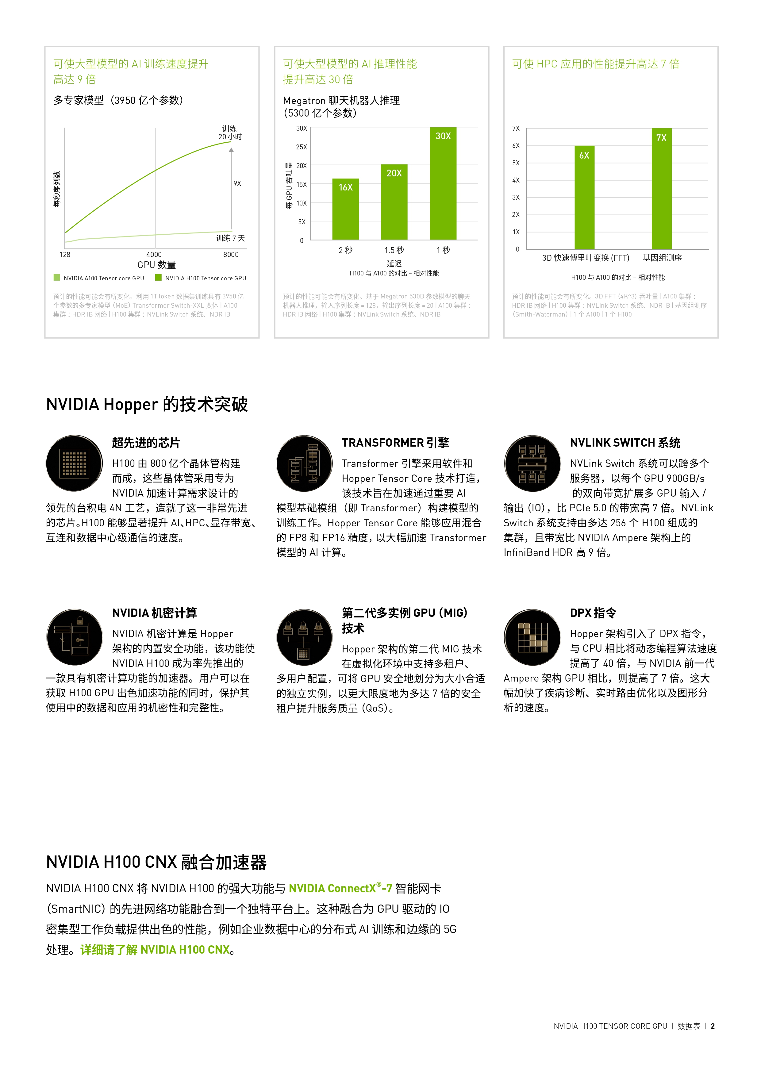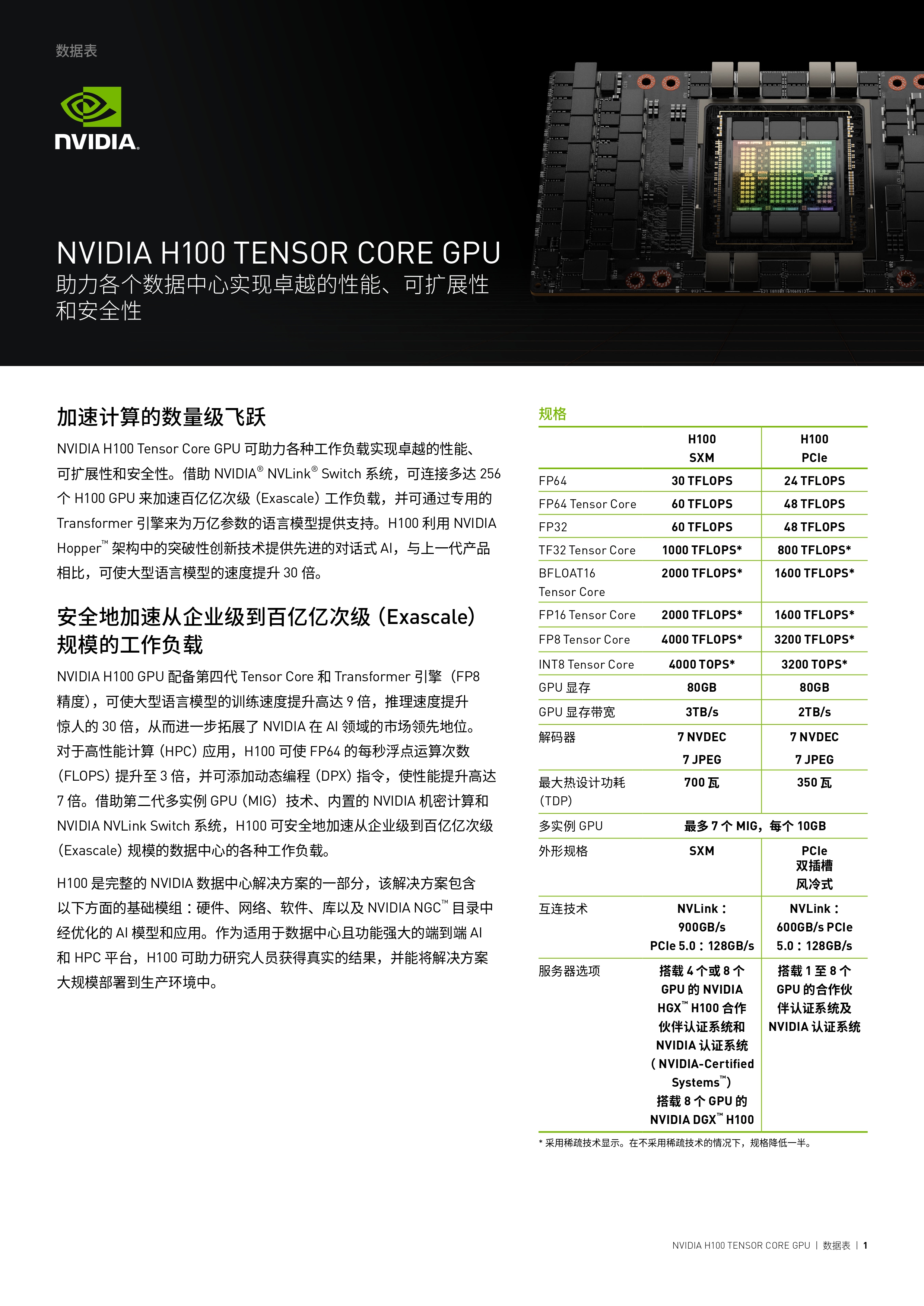 NVIDIA H100 Tensor Core GPU 可助力各种工作负载实现卓越的性能、可扩展性和安全性。H100 利用 NVIDIA Hopper™ 架构中的突破性创新技术提供先进的对话式 AI,与上一代产品相比,可使大型语言模型的速度提升 30 倍。