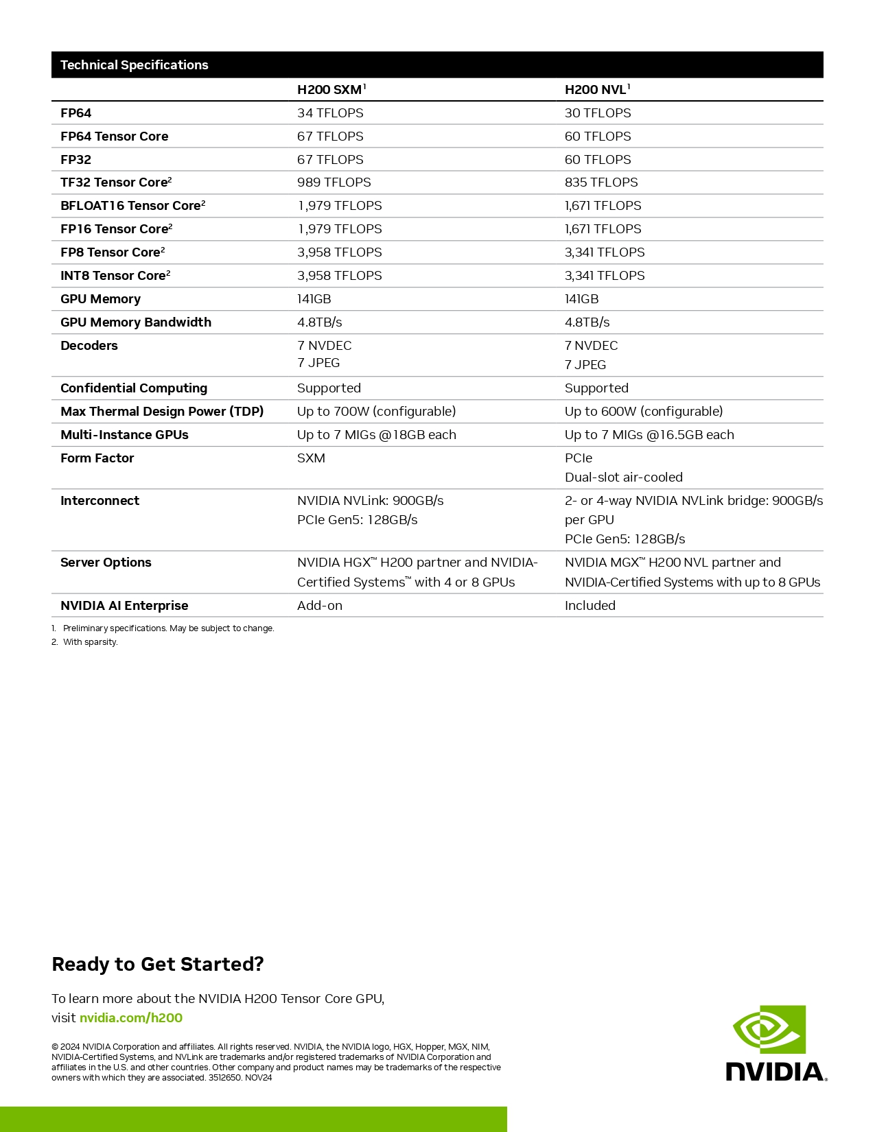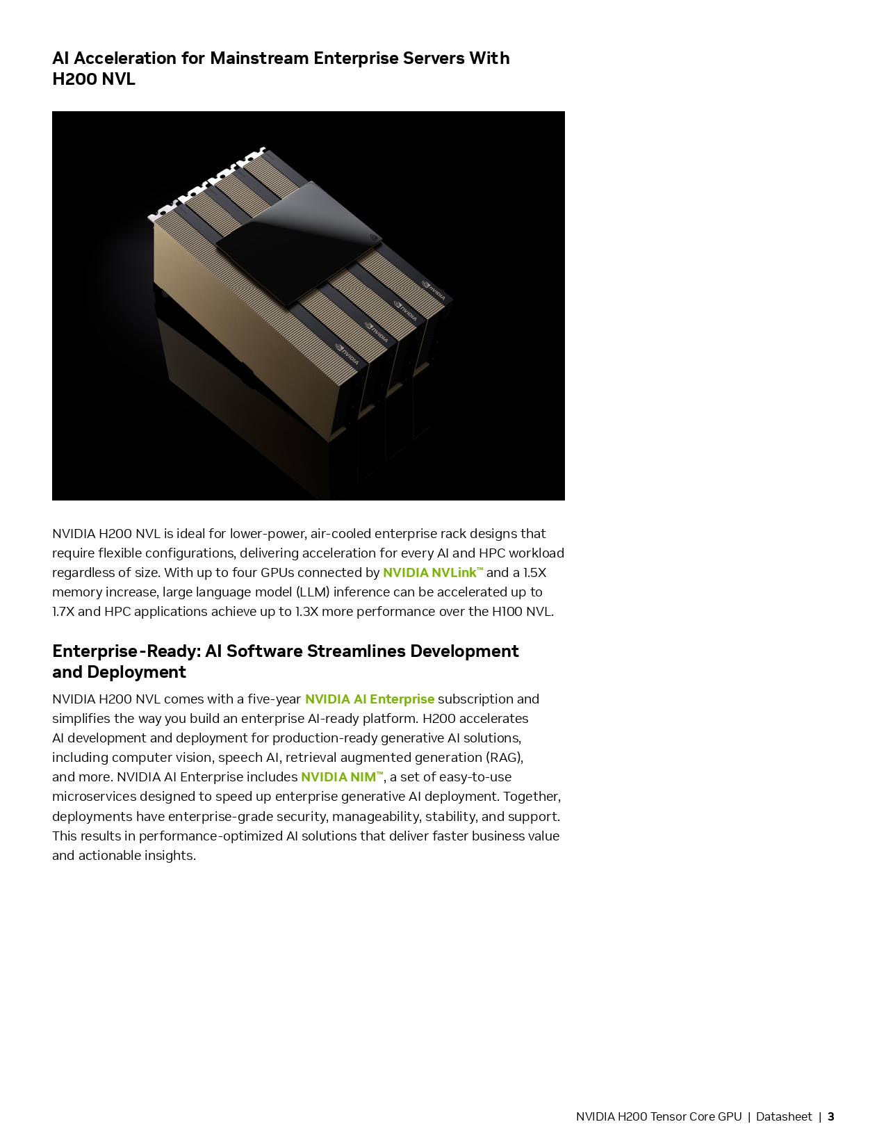 NVIDIA H200 Tensor 核心 GPU 具備顛覆以往的效能和記憶體功能,可大幅強化生成式人工智慧和高效能運算工作負載。H200 是第一款搭載 HBM3e 的 GPU,更大更快的記憶體可加速生成式人工智慧和大型語言模型 (LLM)。