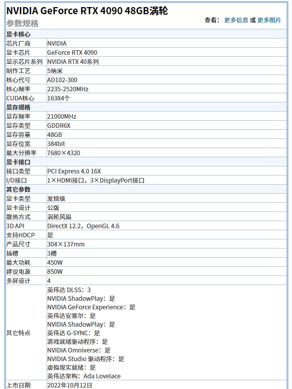 NVIDIA GeForce RTX 4090 48GB 基于 Ada Lovelace 架构,配备 48GB GDDR6X 显存支持 DLSS 3.0 与 AV1 解码,涡轮散热设计(450W 功耗 / 65 分贝噪音),专为 AI 推理、8K 渲染及专业计算优化